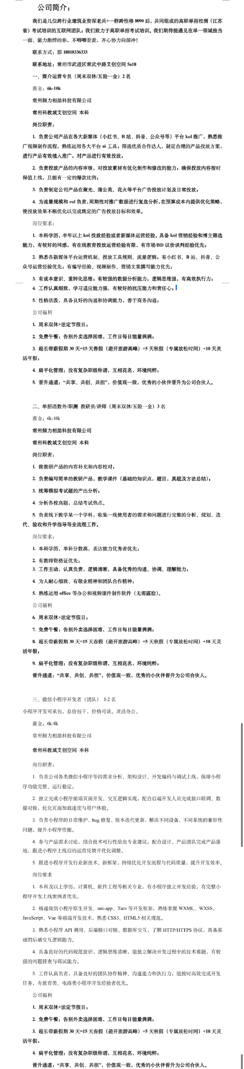 招聘速递[2026028]常州倾力相助科技有限公司招聘